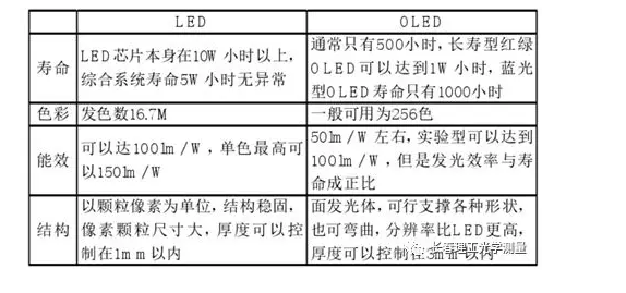 由于材料不同,構(gòu)造不同,加工工藝也不同,所以有很多差異,下面列出了LED與OLED的一些比較特點:
