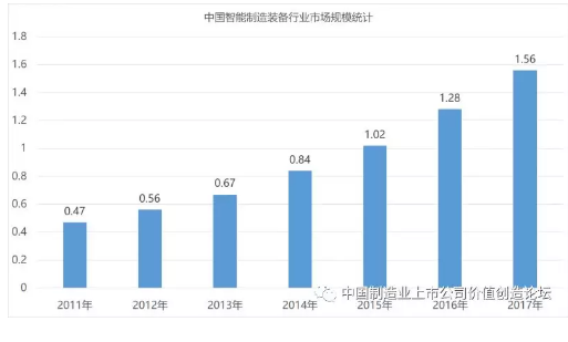 機械裝備的智能化是一個工業(yè)發(fā)達國家的重要標(biāo)志,包含先進的制造技術(shù)以及先進的核心技術(shù),是先進制造技術(shù)、信息技術(shù)和智能技術(shù)在裝備產(chǎn)品上的集成和融合。是國家產(chǎn)業(yè)發(fā)展的原始動力。近年來,我國智能制造裝備行業(yè)增長勢頭迅猛,初步形成一定的規(guī)模。2009年,智能制造裝備行業(yè)銷售產(chǎn)值約為3600億元,2015年智能制造裝備產(chǎn)業(yè)銷售收入超過1萬億元。從2013年開始,中國逐步成為世界最大的機器人市場,未來需求將保持快速增長。隨著制造業(yè)智能化的升級改造,我國智能制造裝備產(chǎn)業(yè)呈現(xiàn)較快的增長,2017年市場規(guī)模突破1.5萬億。
