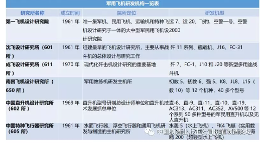 了若干總體研究所和關(guān)鍵技術(shù)研究所,對軍用飛機進行重點研發(fā)。其中601所、611所、650所和602所等主要研發(fā)飛機整機,如殲10、殲20等戰(zhàn)斗機及教練機、直升機等。