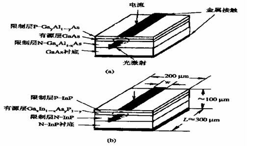 這種結(jié)構(gòu)由三層不同類型半導(dǎo)體材料構(gòu)成,不同材料發(fā)射不同的光波長。圖中標(biāo)出所用材料和近似尺寸。結(jié)構(gòu)中間有一層厚0.1~0.3 μm的窄帶隙P型半導(dǎo)體,稱為有源層;兩側(cè)分別為寬帶隙的P型和N型半導(dǎo)體,稱為限制層。三層半導(dǎo)體置于基片(襯底)上,前后兩個(gè)晶體解理面作為反射鏡構(gòu)成法布里 - 珀羅(FP)諧振腔。