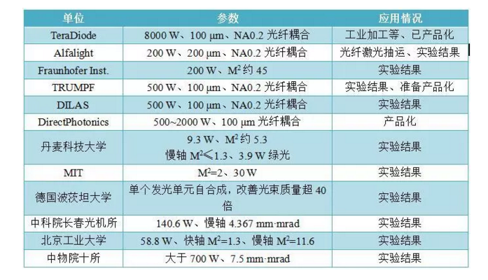 目前,半導體激光波分復用技術(shù)的大致發(fā)展與應用狀況對比如下表所示。
