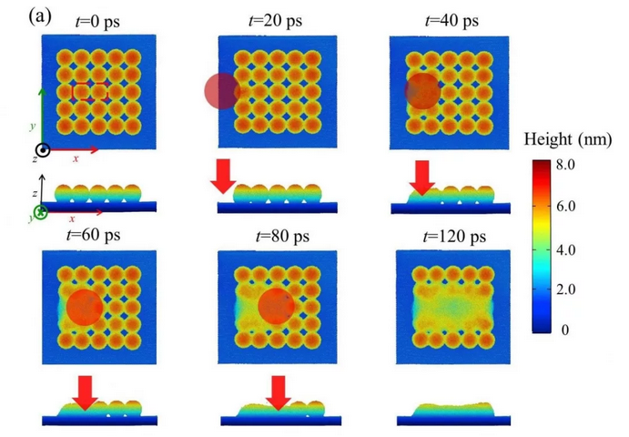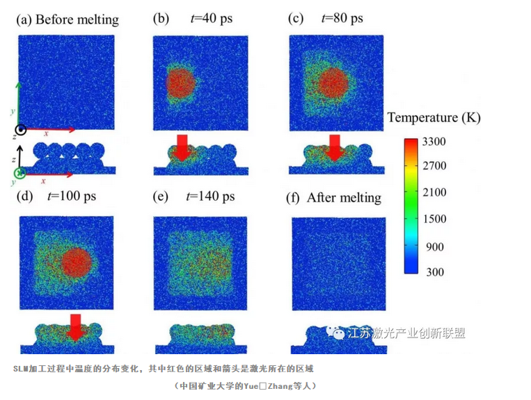 SLM加工過程中溫度的分布變化,其中紅色的區(qū)域和箭頭是激光所在的區(qū)域