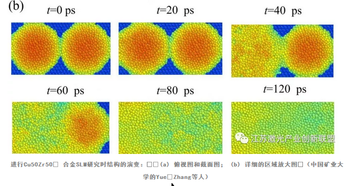 進行Cu50Zr50  合金SLM研究時結(jié)構(gòu)的演變:  (a) 俯視圖和截面圖; (b) 詳細的區(qū)域放大圖 (中國礦業(yè)大學的Yue Zhang等人)