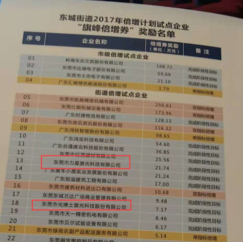 11月20日,東莞市東城街道舉行2017年倍增計(jì)劃試點(diǎn)企業(yè)表彰獎勵會議。據(jù)獲悉,東莞市力星激光、光博士激光入選名單,分別獲得21.7