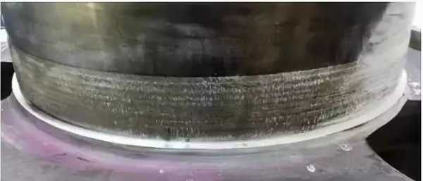 3、對預(yù)熱后的零件進(jìn)行激光熔覆,一般可熔覆3~4mm,如果對修復(fù)位置硬度要求較高,熔覆厚度可能會相對降低,因?yàn)槿鄹矊釉胶?、硬度越高,在不?jīng)過熱處理的情況下,大面積熔覆容易出現(xiàn)裂紋等缺陷。熔覆后的零件如圖2所示。