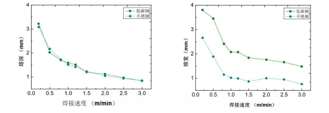 半導(dǎo)體激光焊接低碳鋼和不銹鋼焊縫熔深隨焊接速度的變化規(guī)律如圖 5(左)所示??梢娫摷す夂附觾煞N材料的熔深大體相當(dāng),均隨著焊接速度的提高而減小。當(dāng)焊接速度為 0.2 m/min 時,焊接熔深可達 3.2 mm;當(dāng)焊接速度為 3 m/min 時,焊接熔深可達 1 mm。