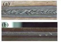 采用半導(dǎo)體激光焊接低碳鋼和不銹鋼,當(dāng)激光功率為 2 kW,焊接速度為 0.2 m/min 時,典型的焊縫表面形態(tài)如圖 2 所示,半導(dǎo)體激光焊接低碳鋼時,表面較不銹鋼的焊縫形貌更寬,魚鱗紋更明顯。另外,焊縫更寬,熱影響區(qū)更大。