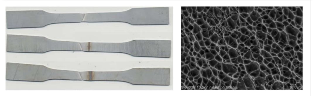 在掃描電鏡下觀察拉伸樣品的斷口形貌,如圖 9(右)所示。可發(fā)現(xiàn)斷口由許多細(xì)小的韌窩結(jié)構(gòu),為典型的韌性斷裂。