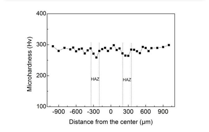 該圖為上述激光焊接橫截面中心區(qū)域的顯微硬度分布??梢娔覆牡钠骄@微硬度約為 280 HV,焊縫中心的平均顯微硬度約為 286 HV,焊縫區(qū)域的顯微硬度略高于母材的顯微硬度,熱影響區(qū)平均顯微硬度最低,約為 269 HV。焊縫的顯微硬度并沒有顯著的差異,其接頭沒有出現(xiàn)明顯的軟化現(xiàn)象。