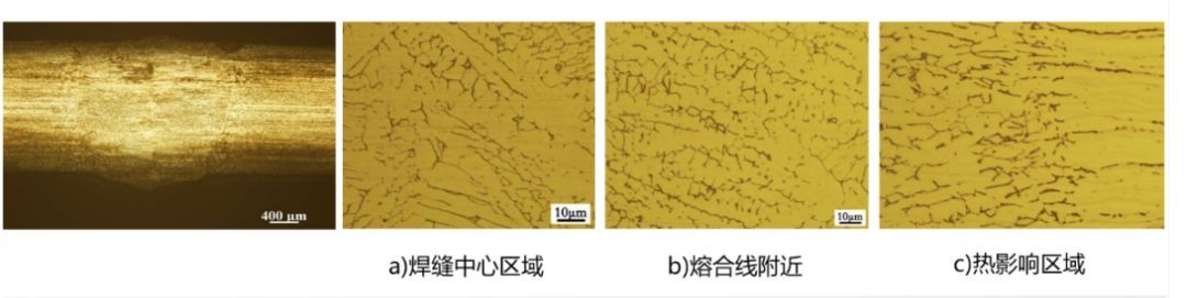 針對激光功率 2 kW、焊接速度為 0.5 m/min 獲得焊縫橫截面繼續(xù)拋光輻射,并放大 50 倍,測量焊接接頭的焊縫中心區(qū)域、熔合線和熱影響區(qū)組成,結(jié)果如圖7所示??梢杂^察到焊縫中心主要以骨架狀等軸晶組織為主,偏離焊縫中心的熔合線附近為垂直于熔池邊界向焊縫中心生長的柱狀晶組織,由于焊接熱影響,熱影響區(qū)晶粒發(fā)生回復(fù)和再結(jié)晶,形成晶粒尺寸略大的沿軋制方向的晶粒組織。造成焊縫不同區(qū)域組織的差異主要與凝固過程中的溫度梯度大小有關(guān),在焊縫中心區(qū)域由于冷卻速度較快,熔池中心溫度梯度小,因此形成細(xì)小的等軸枝晶組織,而越靠近熔合線附近,溫度梯度越大,晶粒沿與熔合線方向垂直向焊縫中心生長,形成略微粗大的柱狀晶組織。
