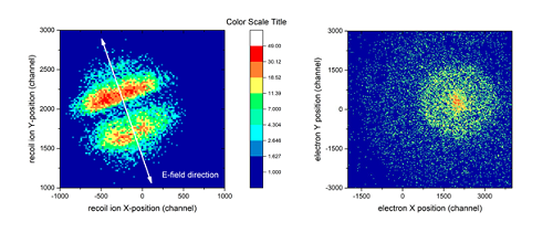 He原子的單光子光電離實(shí)驗(yàn)圖譜。左圖:電子在XUV光子偏振方向上的偶極躍遷導(dǎo)致He+離子的位置譜;右圖:XUV光子電離He原子的光電子在探測器上的投影。