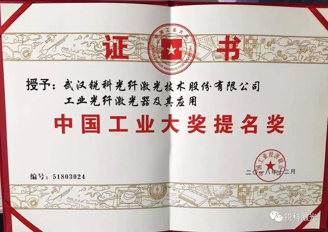 圖:銳科激光中國工業(yè)大獎提名獎證書