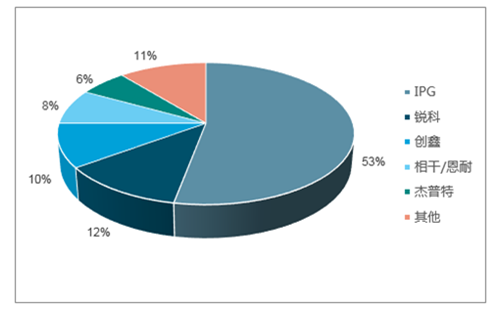 在中國基于激光器的高壁壘,全球光纖激光器企業(yè)主要集中在 IPG、Coherent(Rofin-Sinar)、Trumpf(SPI)、nLight、銳 科激光、創(chuàng)鑫激光、杰普特等企業(yè)中,IPG 是全球光纖激光器的龍頭,在國內(nèi)的光纖激光器市場占據(jù)了 53%的份額,排名第二的是銳科激光的 12%。