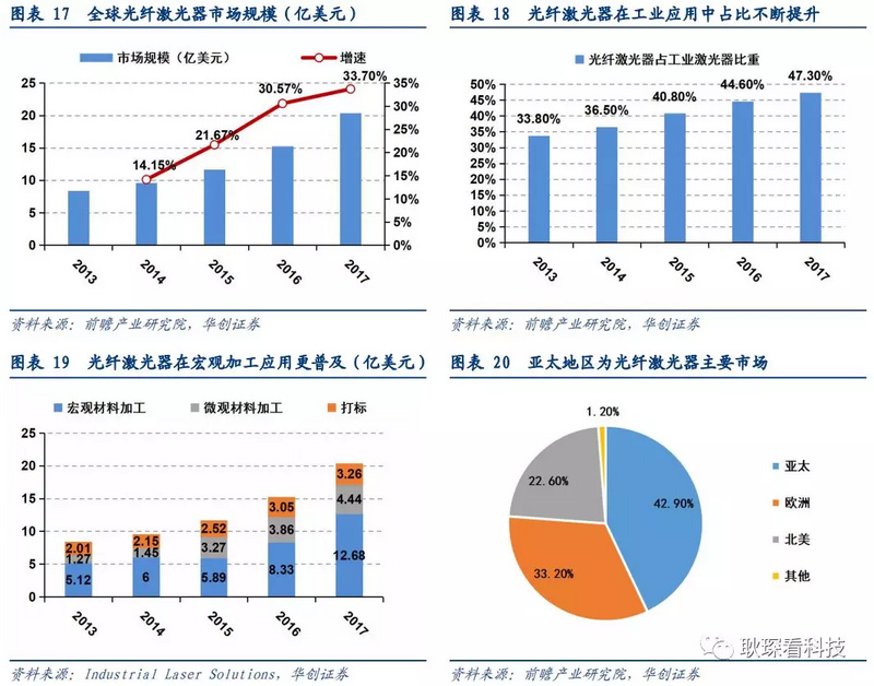 全球光纖激光器市場增長較快,工業(yè)應用占比顯著提高。根據前瞻產業(yè)研究院數據,全球光纖激光器市場規(guī)模從2013年的8.41億美元增長到2017年的20.39億美元,年復合增長率達24.78%。其占工業(yè)激光器市場比重近年來也接近50%,對部分其他類型激光器的替代也逐步顯現。其中,亞太地區(qū)為光纖激光器的主要市場。