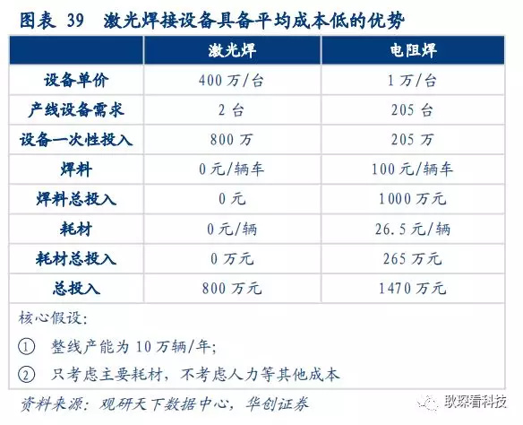 激光焊接設備主要替代傳統(tǒng)電阻焊、電弧焊等焊接形式。雖然激光焊接設備期初投資成本高,但相對傳統(tǒng)焊接設備,激光焊接后續(xù)的焊料、耗材成本大幅降低,激光焊接的精度、高效也是傳統(tǒng)焊接設備無法達到的。據觀研天下數據,我國焊接設備市場空間在600億元以上,提供了一定的替代空間。