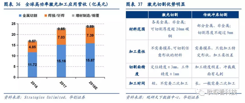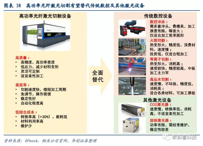 高功率激光切割設備主要替代傳統(tǒng)數控設備。激光切割機是由激光器發(fā)出的激光束經透鏡聚集形成極小的光斑(功率密度高達10^6-10^9W/cm^2),焦點處工件被高溫瞬間汽化,再配合輔助氣體將汽化的金屬吹走,從而切穿成一個小孔。隨著機床移動,無數個小孔銜接起來構成要切的外形。由于激光切開頻率十分高,所以每個小孔銜接處十分光滑。激光切割具備高速高精密、可重復性、異形切割、產能大、材料適應性強等優(yōu)勢。據觀研天下數據,目前傳統(tǒng)沖床市場規(guī)模在200-300億元,激光設備仍有巨大替代空間。
