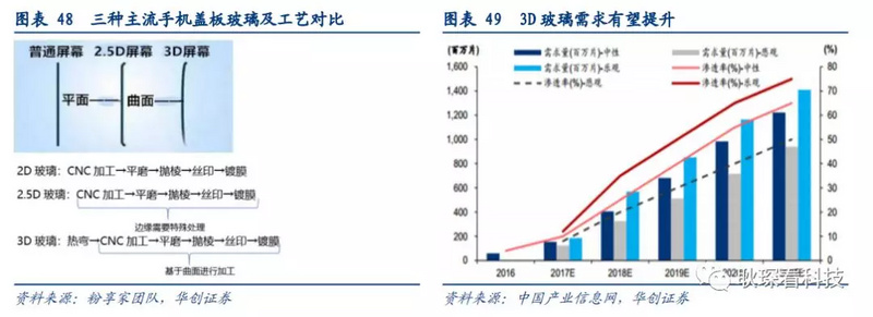 1. 3D玻璃需求升溫:為提升占屏比、獲得更好的視覺效果和握持手感,3D玻璃在許多廠商產品的正面及背面蓋板均有使用。激光工藝主要應用于3D玻璃的外形切割與表面掃光兩個核心工序,是目前業(yè)內主流加工方式。據中國產業(yè)信息網預計,3D玻璃蓋板需求將由2017年的1.24-1.86億片,增加至2021年的9.4-14.1億片,5年總需求量約為26.2-41.8億片。