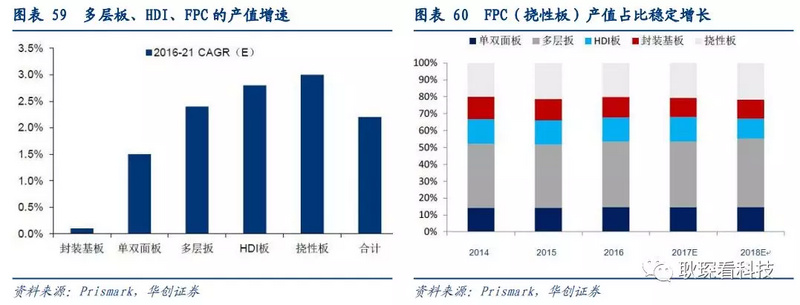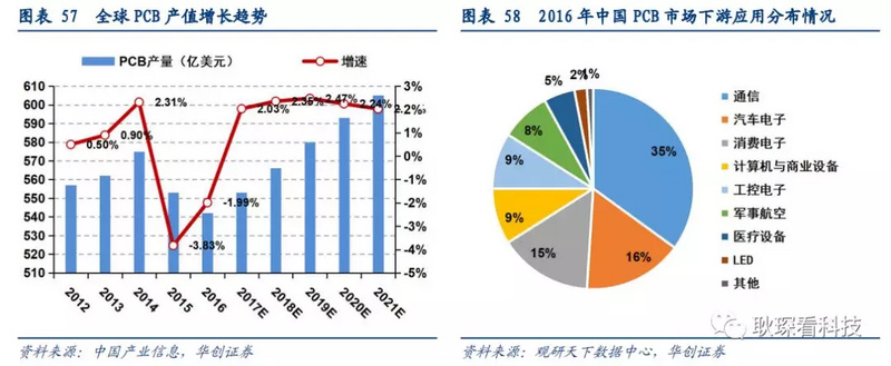 受益于國外PCB產業(yè)向國內轉移,下游通信、汽車、消費電子等產業(yè)的需求猛增,多層板、HDI和FPC的增長速度均領先行業(yè)整體。近年全球PCB行業(yè)產值增長回暖,2016年全球PCB總產值約542億美元。據Prismark 2017年底預測,2017年全球PCB產值增長率將超過2%,達到553億美元;FPC產值規(guī)模有望在2017年達到113.46億美元。近年來整體規(guī)模增長穩(wěn)定,汽車、工控醫(yī)療等下游仍有較快增速。到2021年,全球PCB行業(yè)產值有望達到605億美元。