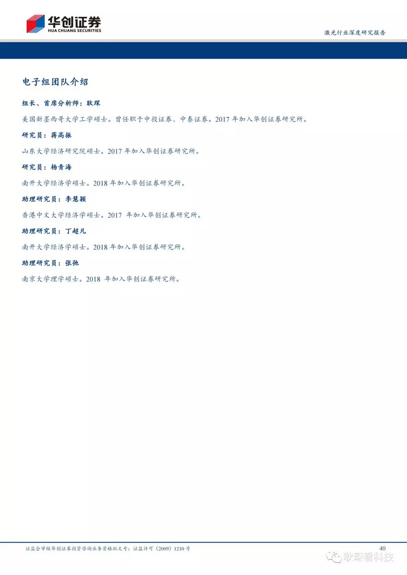 中短期經濟波動致使下游資本開支收縮,技術本質確保長期向上內在驅動力?;仡?9年至今全球激光產業(yè)龍頭近10年季度數據,產業(yè)規(guī)模整體呈周期性波動向上趨勢,以IPG、相干、大族、華工為代表的海內外龍頭公司季度營收穩(wěn)步上行;另一方面,季度同比數據顯示全球激光產業(yè)規(guī)模歷經09H2-10H1、17H1-18H1兩次較大幅度提升后(切割市場滲透、宏觀加工及消費電子創(chuàng)新需求向好),目前受工業(yè)制造宏觀周期、終端產品創(chuàng)新周期、中美 貿易戰(zhàn)等多因素疊加影響,當前產業(yè)處于相對低迷階段。但我們應注意到,國內龍頭設備廠商依托客戶拓展及產品升級,不斷進駐新應用領域(LED、PCB、EV、OLED、半導體)等,在全球激光產業(yè)大周期背景下,有望重復自身成長小周期;以銳科為代表的國產激光器廠商于18年開始逐步突破3300W及6000W等中高功率市場,雖遭遇海外龍頭價格競爭策略,但規(guī)?;慨a與原材料自制比例提升,有望同步降低成本價格,提升下游滲透速度。國內從激光晶體、激光器到激光及配套自動化設備短期產業(yè)波動,中長期向上發(fā)展趨勢不變。