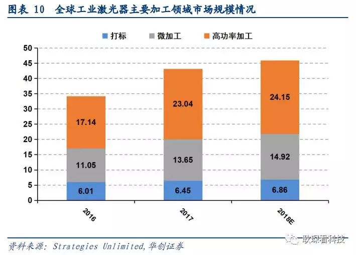 高功率激光器廣泛應用于汽車制造、航空航天、化工、軍工等領域。傳統(tǒng)高功率加工主要由傳統(tǒng)沖床、電阻焊等切割焊接設備來實現,效率低、精度差、損耗高,已無法滿足制造升級的需求。激光器對傳統(tǒng)設備的加速替代已漸趨明顯。據中國報告網數據,2017年全球用于材料加工的大功率激光器市場規(guī)模約14.92億美元,占激光器市場的14%,材料加工用激光器的48%。目前國內僅沖床加焊接市場就有近千億規(guī)模,而國內大功率激光設備市場規(guī)模僅在100億元左右,激光加工滲透率仍處于較低水平。