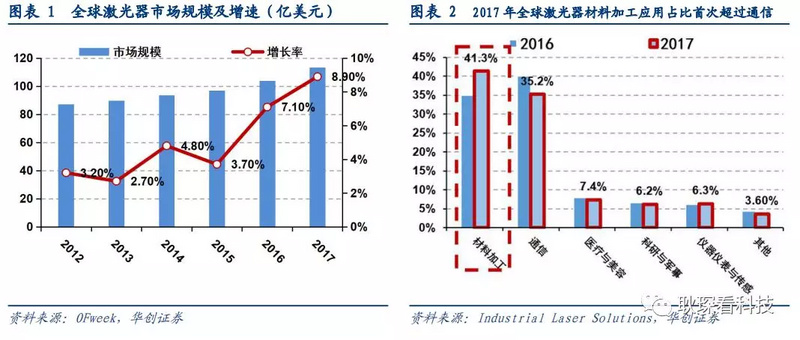 激光行業(yè)市場規(guī)模整體維持增長態(tài)勢,激光加工設備占比擴大。據OFweek數據,全球激光器市場規(guī)模從2012年87.3億美元到2017年113.3億美元,年復合增長5.35%,2017年同比增速達8.9%,預計未來仍將保持10%左右增長。其中2017年全球工業(yè)激光器市場規(guī)模約為50億美元。在品類繁多的激光設備市場中,我們重點關注與激光加工設備相關的市場。2017年全球激光加工設備市場規(guī)模約為170億美元,國內市場規(guī)模約為全球的33%左右,即56億美元左右。在應用領域中,材料加工與通信占比最大,分別高達41.3%和35.2%,且近年來材料加工占比不斷擴大。