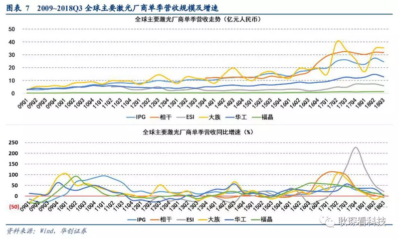 激光產業(yè):回顧09年至今全球激光產業(yè)龍頭近10年季度數據,產業(yè)規(guī)模整體呈周期性波動向上趨勢,以IPG、相干、大族、華工為代表的海內外龍頭公司季度營收穩(wěn)步上行;另一方面,季度同比數據顯示全球激光產業(yè)規(guī)模歷經09H2~10H1、17H1~18H1兩次較大幅度提升后(切割市場滲透、宏觀加工及消費電子創(chuàng)新需求向好),目前受工業(yè)制造宏觀周期、終端產品創(chuàng)新周期、中美 貿易戰(zhàn)等多因素疊加影響,當前產業(yè)處于相對低迷階段。但我們應注意到,國內龍頭設備廠商依托客戶拓展及產品升級,不斷進駐新應用領域(LED、PCB、EV、OLED、半導體)等,在全球激光產業(yè)大周期背景下,有望重復自身成長小周期;以銳科為代表的國產激光器廠商于18年開始逐步突破3300W及6000W等中高功率市場,雖遭遇海外龍頭價格競爭策略,但規(guī)模化量產與原材料自制比例提升,有望同步降低成本價格,提升下游滲透速度。國內從激光晶體、激光器到激光及配套自動化設備短期產業(yè)波動,中長期向上發(fā)展趨勢不變。