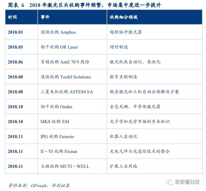 激光行業(yè)高技術壁壘的特點加速技術、人才和資本等優(yōu)勢向頭部集中。激光行業(yè)馬太效應明顯,龍頭的優(yōu)勢一旦形成,與其他廠商差距往往會拉開。從國外激光廠商的發(fā)展史可以看出,龍頭往往先是以雄厚的技術積累和產業(yè)鏈整合能力為基礎,而后通過系列收購不斷完善技術和產品布局,最終在細分領域可能形成寡頭壟斷局面。據OFweek與Strategies Unlimited提供的市場規(guī)模與份額數據推算,當前全球工業(yè)激光市場(含激光器、激光設備等)規(guī)模約在200億美元以上。根據各廠商2018年業(yè)績指引與估計,從行業(yè)整體的集中度來看,激光市場前5大廠商約占51%的市場份額。