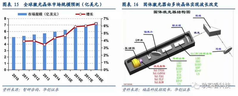 晶體需求彈性大,微加工領域的固體激光器需求增加有望帶動其增長。晶體主要應用于固體和光纖激光器,占激光器總價值約5%,其中占固體激光器總價值約10%。固體紫外激光器需要多塊晶體倍頻以達到理想的波長輸出。此外由于各類晶體的使用壽命一般短于激光器使用壽命(受環(huán)境影響較大),以福晶為例,主要產品LBO、BBO、KTP、Nd:YVO4等品質保證期均為“一年內正常使用”,因此需定期更換晶體,賦予了晶體需求更大的彈性。