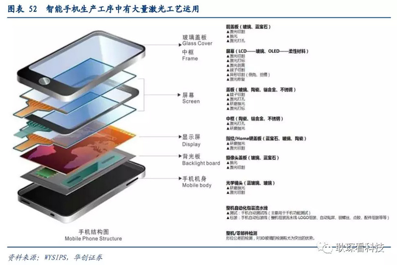 手機等電子設備內部結構日趨復雜精細,激光可進行精密加工。智能機生產工序中涉及到的激光應用主要有:切割、焊接、拋光、打孔、打標、激光修復等。隨著手機等電子設備對一體化、輕薄、炫麗外觀的追求,緊湊的空間內對生產工藝提出了新的要求,因此手機中有大量零部件加工通激光工藝來實現。