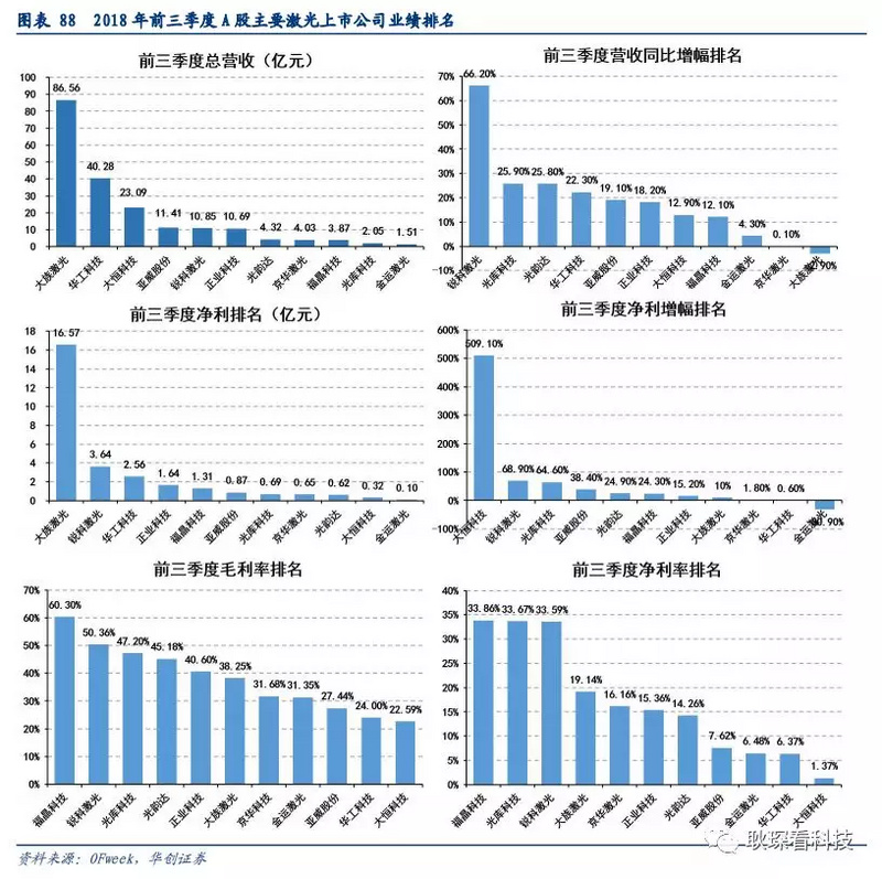 1、2018年前三季度A股主要激光上市公司業(yè)績排名