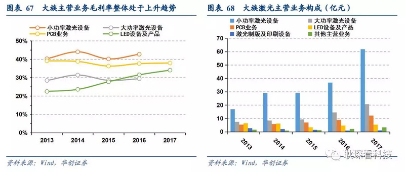 小功率激光設備已占國內近一半市場份額,激光打標設備全球市場份額領先。雖然小功率市場已經成為紅海,但大族的優(yōu)勢仍然在高端、前端、先進的設備上得以體現。大族小功率板塊主要為光纖和紫外激光設備。2017年受益于A客戶創(chuàng)新改款,訂單增長顯著。小功率激光打標、精密焊接、精密切割等業(yè)務實現營收61.88億元,在大族營收中占比50%以上,同比增幅高達68%,表現依舊強勁,是公司業(yè)績增長的主要動力。小功率板塊毛利率較為穩(wěn)定,但業(yè)務體量增長值得期待,主要得益于差異化產品的切入,積極爭取三星與HOV訂單,同時配合面板廠推進OLED設備國產化。