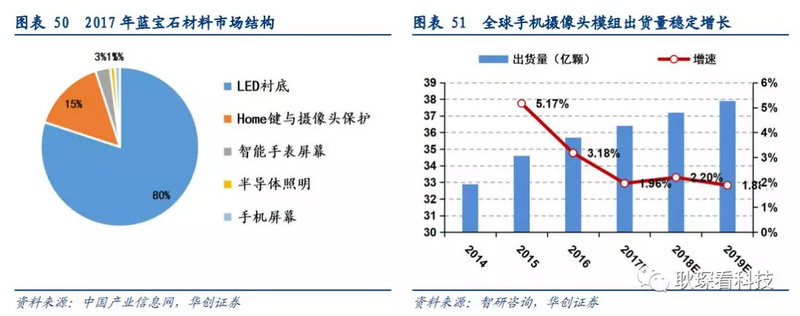 2. 藍寶石市場空間可觀:藍寶石晶體集優(yōu)良的光學、化學、物理性能于一身,具有強度高、硬度大、耐沖刷等特性,而藍寶石的切割加工離不開激光工藝。主要應用有:LED襯底、智能機攝像頭保護、Home 鍵、藍寶石表鏡等。據智研咨詢數據,LED襯底對藍寶石需求量占比最大,達80%以上;其次為Home鍵與攝像頭,占比約為15%。而在LED產品的應用中,手機及其他電子設備占比高達59%。在智能機攝像頭應用上,雙攝已成主流,華為開啟三攝時代,未來四攝時代也已不遠,藍寶石的鏡頭防護應用的需求料將持續(xù)增長。據YOLE數據,預計到2019年,藍寶石市場規(guī)模將達到81.85億美元,近8年年均復合增長率達57%,前景十分可觀。