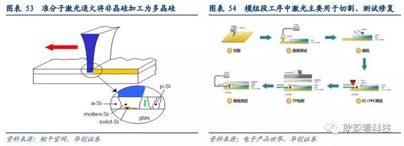 激光加工在OLED面板生產中至關重要。OLED面板的制造主要分為背板段、前板段和模組段三道工序,激光工藝貫穿始終:在背板段主要是準分子激光退火;前板段主要是LLO激光剝離及柔性切割;模組段主要是切割、測試修復及窄邊框加工等。