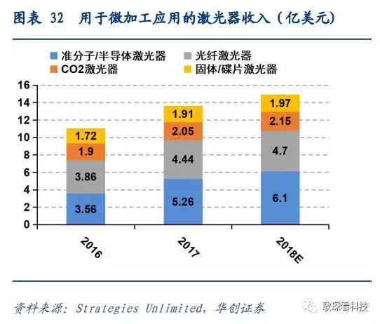 按激光器類型劃分,我們重點關注成長性較好的光纖激光器,據OFweek數據,目前其市場份額最高,達36%以上。在材料加工細分中,打標的規(guī)模增速逐漸放緩,而微加工和高功率加工近兩年增速顯著。