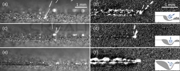 使用激光功率掃描單個(gè)軌道(從左到右掃描方向)時(shí)的側(cè)視圖和俯視圖的高速圖像,掃描速度為(a)和(b)50 W和0.1 m / s;(c)和(d)100W和0.5m / s以及(e)和(f)200W和1m / s。插圖是熔池形狀的示意圖,其決定了激光羽流方向。所有數(shù)字的視頻都包含在補(bǔ)充材料中。