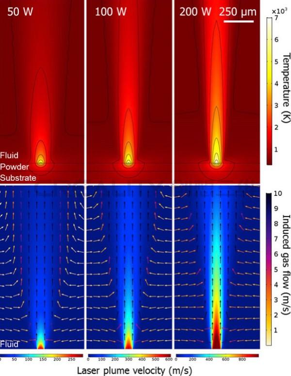 (上)計(jì)算50,100和200 W激光功率的溫度場。(底部)快速激光羽流的計(jì)算速度表面圖,箭頭表示它引起的較慢的大氣氣流。