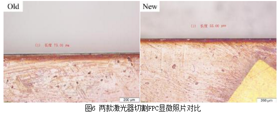 圖6為兩款激光器切割0.16mm厚FPC外觀(guān)效果對(duì)比圖。憑借FORMULA 15W@50KHz激光器短脈寬與高頻率下的高速度,F(xiàn)PC的切割質(zhì)量更好,熱影響相比舊款減小了約26%,同時(shí)有效切割速度從50mm/s提高到70mm/s,提高了約40%。