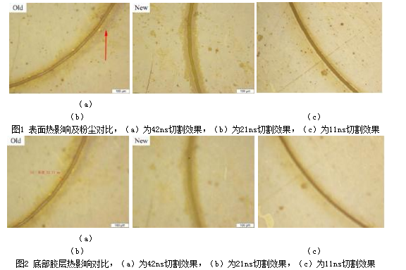 圖1為表面熱影響及粉塵對(duì)比,可以明顯發(fā)現(xiàn)脈寬越長(zhǎng),切割道附著的粉塵以及顆粒會(huì)越多,而這些粉塵很容易附著在電路上從而引起短路。圖2為切割后底部膠層熱影響對(duì)比,脈寬為42ns時(shí)的熱影響約為22.7μm;而脈寬為21ns以及11ns時(shí)切割后底部基本看不到膠層的熔融。通過(guò)以上實(shí)驗(yàn)發(fā)現(xiàn)脈寬越短越有利于覆蓋面的加工。
