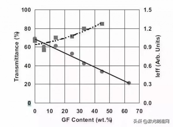 對于填充型聚合物材料來說,光學性能受到填充材料的影響較大。以玻纖為例,Val Kagan研究了不同玻纖含量的PA6增強樹脂的透過率(圖3),發(fā)現(xiàn)隨著玻纖含量的增加,材料的透過率是線性下降的。