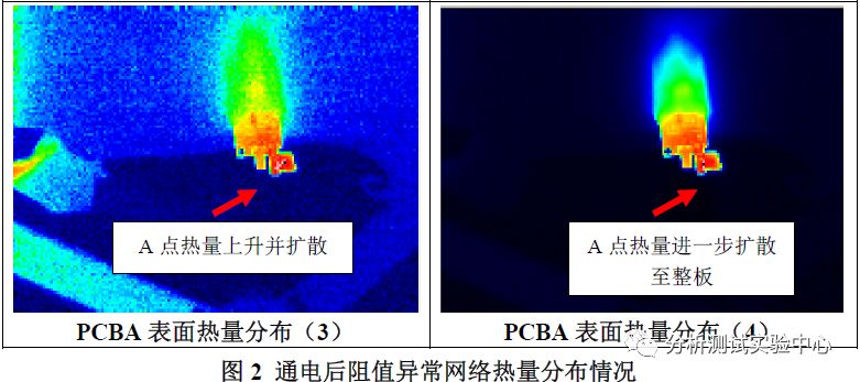對故障網(wǎng)絡(luò)施加一個大小為0.4A的直流恒定電流,根據(jù)焦耳定律Q = I2*R*t可知,阻值偏大的區(qū)域發(fā)熱量也越大。使用紅外熱成像儀對故障網(wǎng)絡(luò)進行發(fā)熱量探測,根據(jù)PCBA上發(fā)熱量高低的分布情況,來定位出阻值偏大的點,分析結(jié)果如下圖2所示: