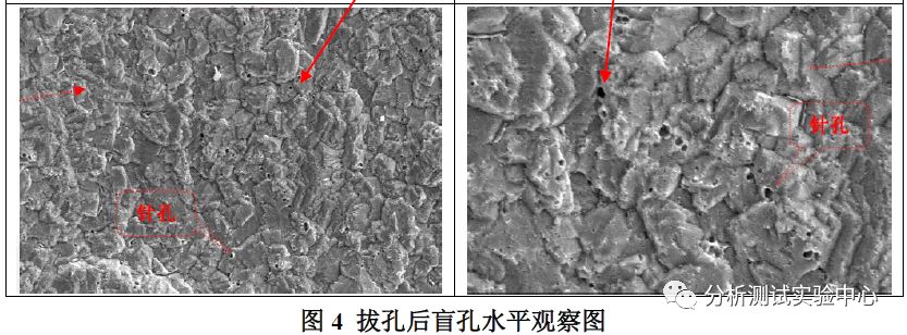 將盲孔中的孔銅直接拉拔出來,使用掃描電鏡觀察盲孔底部和孔銅底部的情況,分析結(jié)果如下圖4所示: