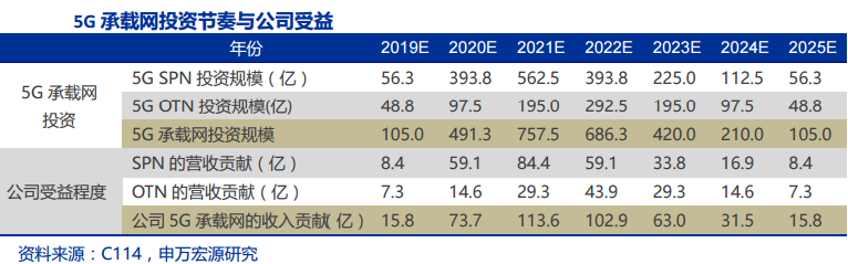 2019年是5G承載網(wǎng)投資開啟的元年,烽火通信SPN/OTN等主要業(yè)務(wù)產(chǎn)品線將迎來周期性高增長。申萬宏源預(yù)計總受益規(guī)模將達416億元,是公司現(xiàn)有收入的2倍,預(yù)計在2021年迎來增量高點,將貢獻超100億營收。公司通信系統(tǒng)收入受益于SPN/OTN建設(shè)2020年增速有望超過30%。