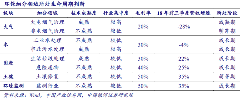 銀河證券指出,環(huán)保行業(yè)細分領(lǐng)域所處周期差異大,市場空間和技術(shù)水平是決定性因素。預(yù)計未來三年非電煙氣處理、流域治理、土壤修復(fù)、危廢處理、環(huán)境監(jiān)測等幾大熱門領(lǐng)域市場空間接近2萬億。市場競爭不規(guī)范、技術(shù)成果轉(zhuǎn)化率低、過度依賴政府補貼是限制環(huán)保行業(yè)發(fā)展的三個重要因素。