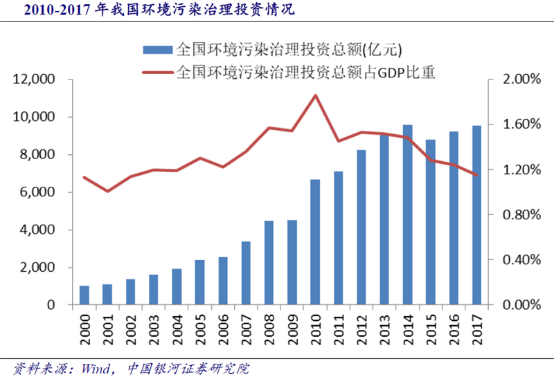 銀河證券指出,2000-2017年,我國環(huán)境治理投資總額從1014.9億元增長至9539億元,年復(fù)合增長率為13.2%,2017年環(huán)境治理投資總額占GDP的1.15%。根據(jù)國際經(jīng)驗,當(dāng)治理環(huán)境污染的投資占GDP達1%-1.5%時,可以控制環(huán)境惡化的趨勢,當(dāng)該比例達到2%-3%時,環(huán)境質(zhì)量可有所改善。發(fā)達國家在20世紀70年代環(huán)境保護投資占GDP的比例已達2%,《全國城市生態(tài)保護與建設(shè)規(guī)劃(2015-2020年)》提出,到2020年,我國環(huán)保投資占GDP的比例不低于3.5%,環(huán)保投資仍有很大提升空間。