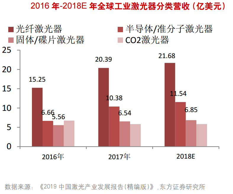 東方證券還指出,中國為激光設(shè)備最大應(yīng)用市場,國內(nèi)增速顯著高于全球。2018年國內(nèi)激光設(shè)備市場銷售收入突破600億,同比增速達到22.2%,而我國因材料加工應(yīng)用占比較高,從結(jié)構(gòu)看,光纖激光器份額2017年達到55%,2018年預(yù)計為60%左右。