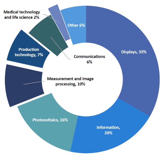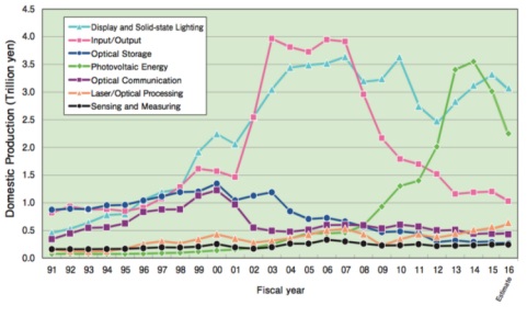 在過(guò)去的幾年中,隨著全球趨勢(shì),日本光電子產(chǎn)品在生產(chǎn)技術(shù),測(cè)量和圖像處理以及醫(yī)療技術(shù)和生命科學(xué)方面的增長(zhǎng)。然而,日本在信息技術(shù)(輸入/輸出),光學(xué)元件和系統(tǒng)(光通信),通信,顯示器和光伏發(fā)電方面的份額下降。