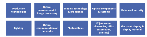 與電子產(chǎn)品一樣,光子產(chǎn)品正在許多不同的應(yīng)用和廣泛的領(lǐng)域中使用。Photonics21在圖1所示的十個(gè)部門中對(duì)它們進(jìn)行了總結(jié)。在生產(chǎn)技術(shù)部分,有激光材料加工系統(tǒng)、光刻系統(tǒng)、用于生產(chǎn)技術(shù)的激光和用于晶圓步進(jìn)器的物鏡。在測(cè)量和圖像處理部分,有機(jī)器視覺(jué)、光譜儀和模塊二進(jìn)制傳感器和各種測(cè)量系統(tǒng)。在醫(yī)療技術(shù)和生命科學(xué)領(lǐng)域,以下產(chǎn)品 - 用于眼鏡和隱形眼鏡的鏡片(未包括在日本工業(yè)的進(jìn)一步概述中),用于醫(yī)學(xué)治療內(nèi)窺鏡顯微鏡醫(yī)學(xué)成像、眼科和美學(xué)的激光系統(tǒng),以及其他醫(yī)藥學(xué)和生物技術(shù)研發(fā)診斷系統(tǒng)。
