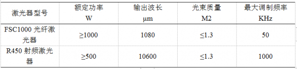 光纖激光器采用熱刺激光技術(shù)有限公司FSC1000光纖激光器,CO2射頻激光器采用熱刺激光技術(shù)有限公司R450射頻激光器,其基本參數(shù)如表1所示。