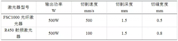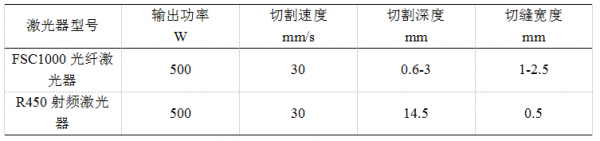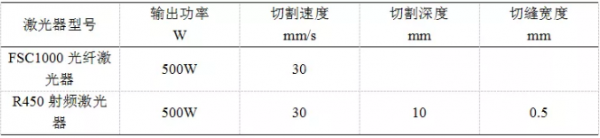 射頻激光器采用焦距為101.6mm聚焦鏡,最終聚焦光斑約為0.2mm。光纖激光器芯徑為20微米,采用100:150mm準(zhǔn)直、聚焦系統(tǒng),其聚焦光斑遠(yuǎn)小于射頻激光系統(tǒng)聚焦光斑,為保證對比試驗(yàn)可靠性,切割時將其離焦至材料表面激光光斑直徑也為0.2mm。