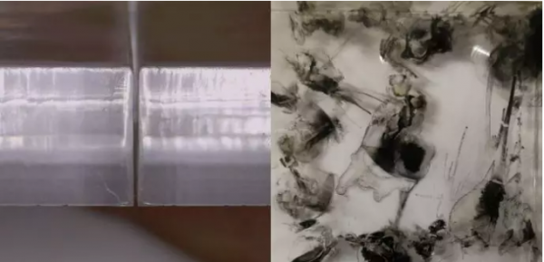 圖3可以看出,射頻激光器切割亞克力板切割面光滑整齊,割縫較細(xì),可以達(dá)到良好的切割效果。光纖激光器切割亞克力板,板材表面有較淺的融化痕跡,內(nèi)部局部吸收熱量后材料炸裂,炸裂位置產(chǎn)生黑色的燃燒雜質(zhì),板材整體無法進(jìn)行切割。